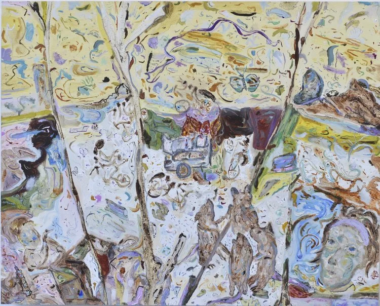 My most recent painting is called You must not be seen. The title comes from a line in a learning-play I’m acting in, The Measures Taken, by Bertholt Brecht. It depicts someone throwing an object in a chaotic scene, forcefully and with wind and movement. Supporting them are some friends, perhaps comrades, a group of sweet demons. And embedded in this character is another image of the action, but still and sharp, like a surveillance image of the act in progress. In its most basic bones, I’m using homemade oil paint made from pigments from Sawkill Creek predominantly, and store-bought oil paints, to create a scene expressing anger, violence, conflict - and the poisonous cultural system of surveillance that keeps people oppressed.