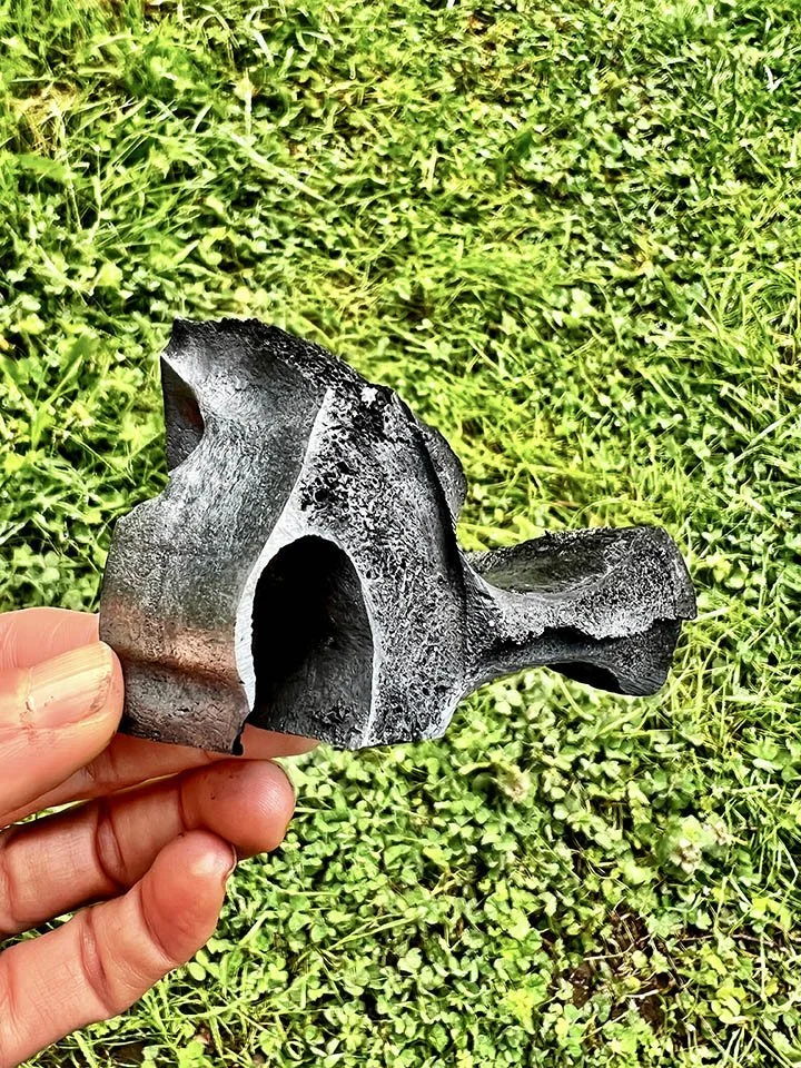 Parts of the process of making the pigment also felt immensely violent — I had to cut big bones into small pieces with an angle grinder, a deafening power tool that covered me in rancid, white, death-smelling dust. The fire necessitated burning the dead, cut, dried bodies of trees. The heat from the metal fire pit I was using killed the new, electric green spring grass below and around it. When I removed the bones from the tins in which they carbonized, each was a radiant dark sculpture, each an utter perfection of form. I proceeded to crush each perfect form to dust with the force of my body and will as applied to a mortar and pestle.