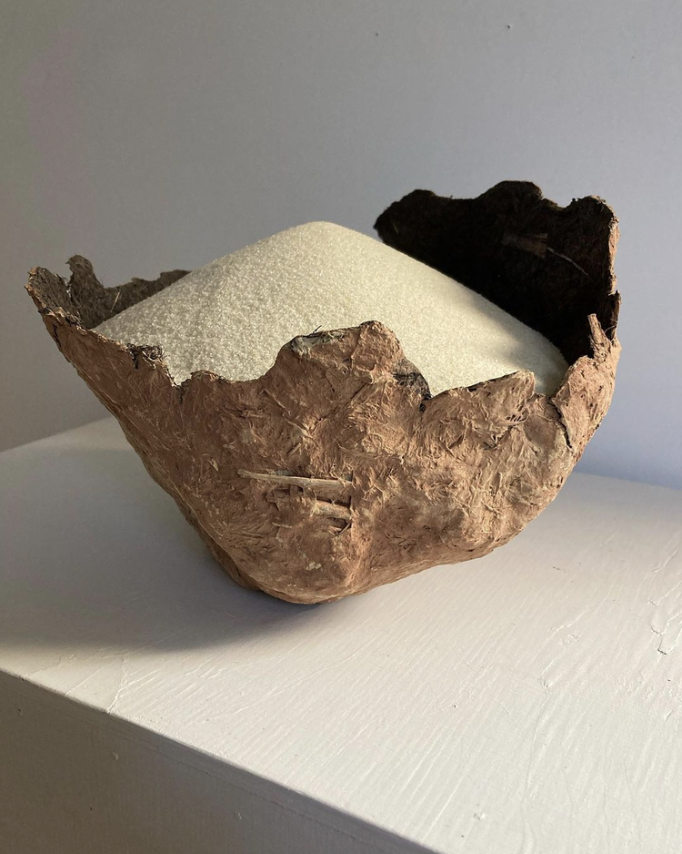 Overreach, by Teri Power; cattails, clay, fracking sand; 2022. Image courtesy of Teri Power.