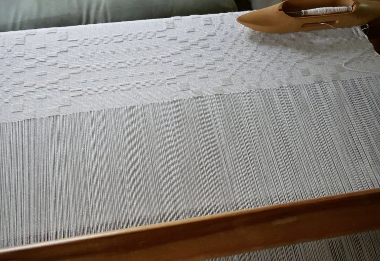 Pigment-reclamation cloth by Noelle Guetti on the loom. Image courtesy of Noelle Guetti.