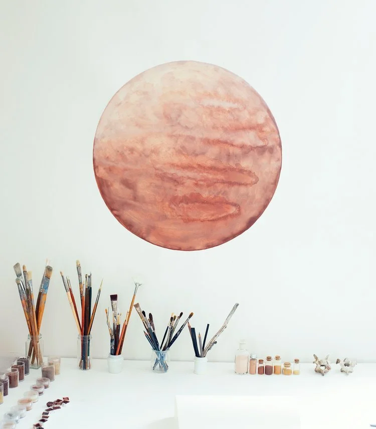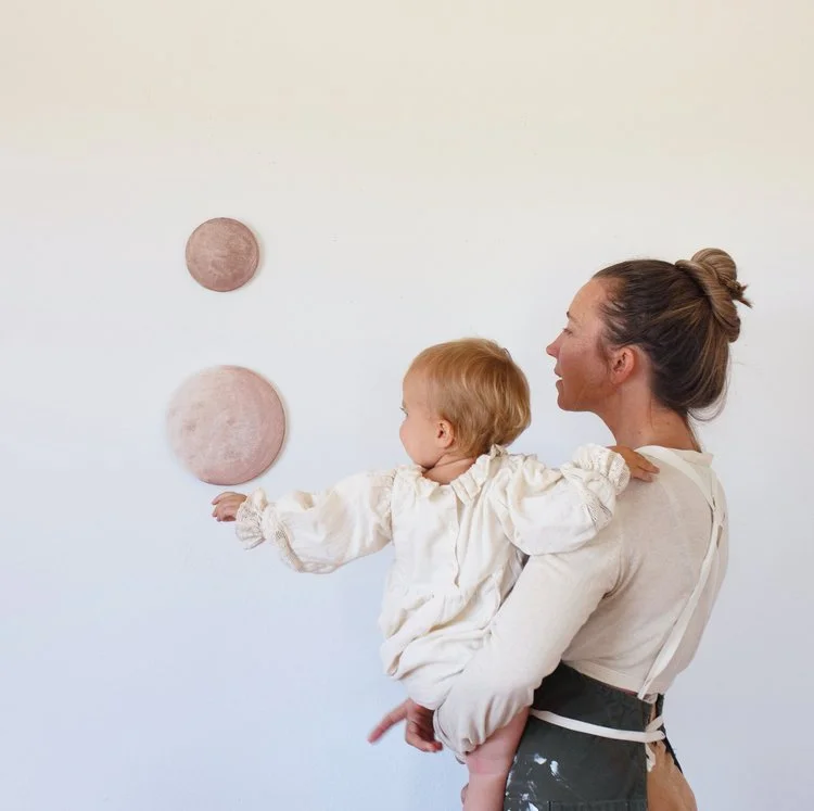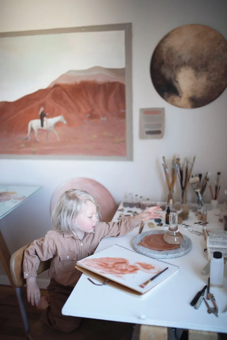 Artist Stella Maria Baer’s work and life, as I first beheld it on Instagram several years ago, instantly seduced me with a beauty that travelled with tender continuity from dawn-dusk shots of deserts skies and mountains, to round, planetary canvases dimensional with layers of paints made from desert dusts, to the family scenes of her kids dressed in earthy crepuscular hues.