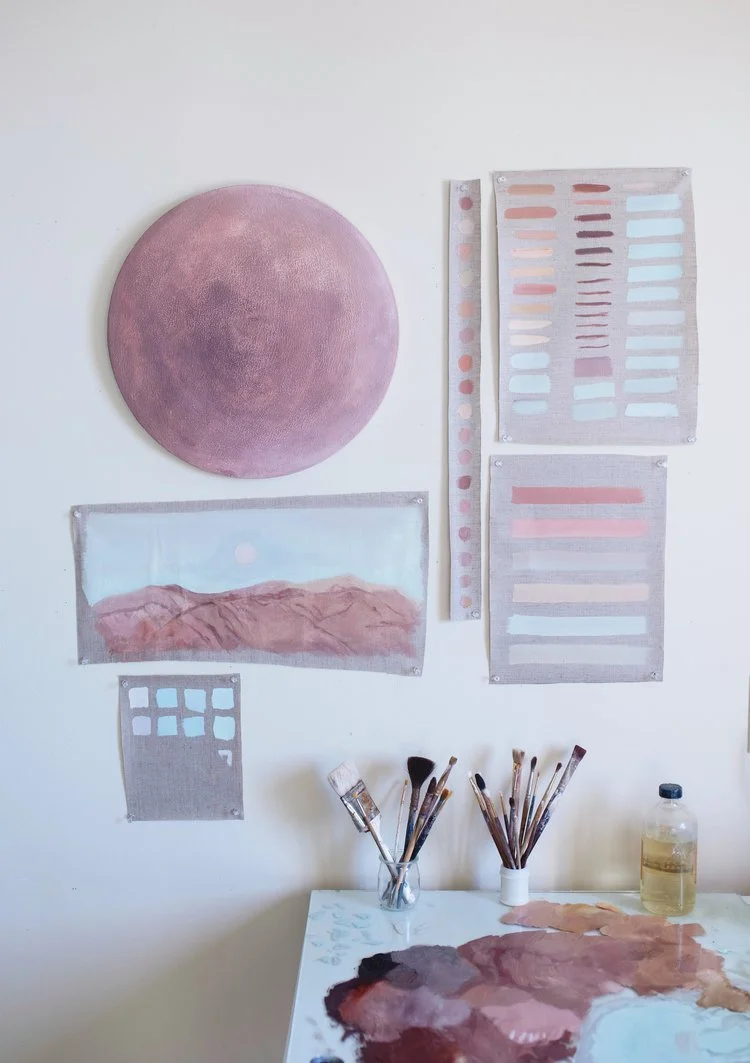 SMB: I first started painting moons and planets in 2014, while I was living on the east coast, and beginning to feel a pull back to where I grew up in New Mexico. Around that time my mother started losing her memory, in what we would later learn was Alzheimer’s. I wasn’t conscious of choosing to make paintings inspired by the colors I remembered from childhood, it was just something I found myself doing, and have since then tried to understand as best I can. In many ways all my work feels that way. I try to approach it with words and there are things I can say but at the end of the day the paintings are something beyond language and that’s why I feel compelled to make them. My mother used to take us camping in canyons surrounded by pink rock, and some of my favorite memories with her are of waking up in the desert, surrounded by those colors, watching the sun rise. We didn’t have a tent, and sometimes we’d wake up in the night and see stars falling above us. For the past few years I’ve collected dirt and rock along a highway to one of the campsites she’d take us to, and every time I do I feel like I’m moving in circles around my own memory, trying to recover something that’s lost, trying to find her.